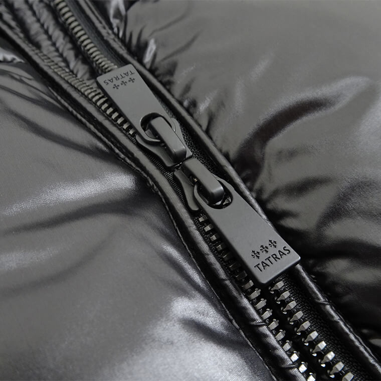 タトラスのデビュー当時から定番として続いている人気モデル「KRAZ」の後継モデル。ダウンなのに細身というTATRASのイメージを象徴付けるスタイリッシュなシルエットで流行に流されずお召し頂けるモデルです。高級感のあるシャイニーな質感のナイロンが大人の男にふさわしいアイテム ツイル組織にすることにより、光沢感が長く保てるようにしております。